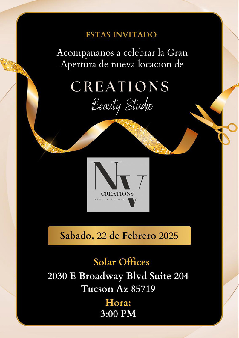 Creations Beauty Studio abrirá sus puertas en el 2030 E Broadway Blvd Ste 204 a las 3PM el sábado 22 de febrero de 2025.